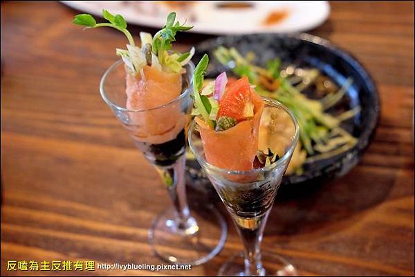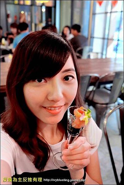 燻鮭魚還蠻好吃的 裡面夾蔬食生菜很爽口 用小高腳杯裝挺可愛的
