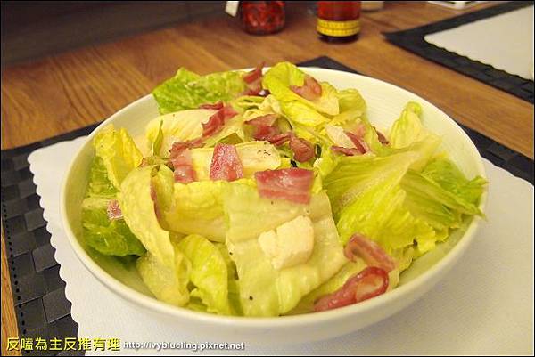 有美國蘿蔓和培根 麵包粒 灑上起司粉和黑胡椒 搭配凱薩醬 屬於口感濃郁型的沙拉