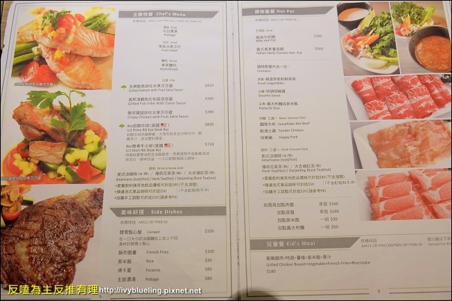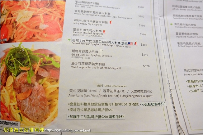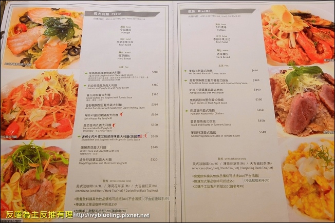 晚餐時段有提供義大利麵 燉飯 排餐 鍋物 還有一些甜點輕食 大部分餐點為320-420元間 皆採套餐方式