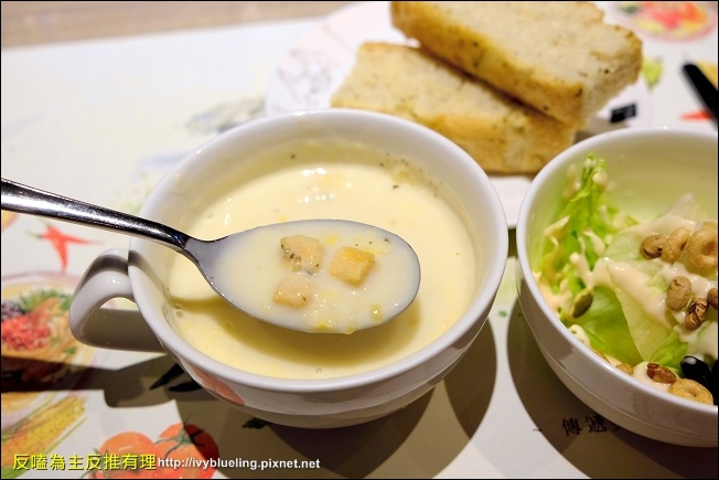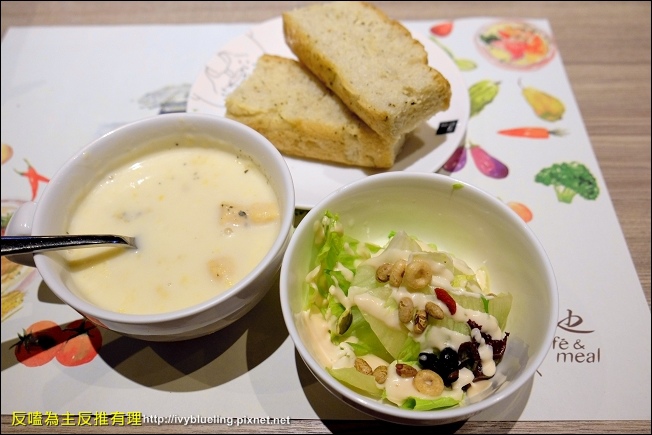套餐有湯 沙拉 麵包 主菜 飲料 還可以加購甜點(可折20元)