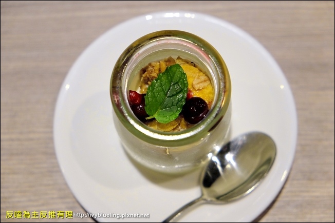 鮮奶酪奶香味蠻濃郁的 上面還有酸的果粒和一片薄荷葉